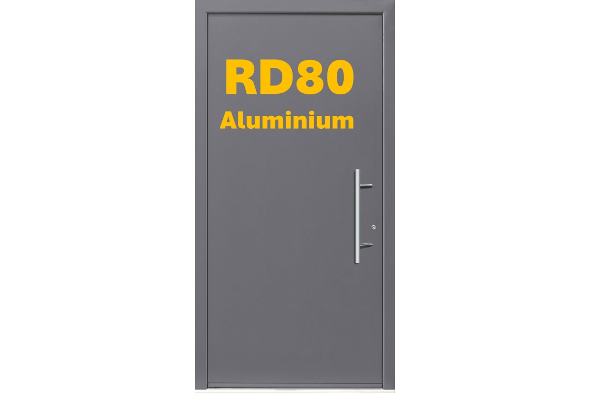 Plain surface aluminium door. U-value 0.68 w/m2K, magnetic pop-up threshold seal.